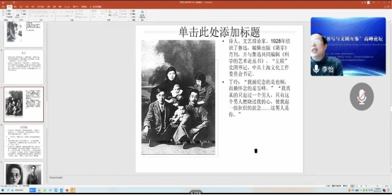 在强调思政课重要性的基础上,李怡院长将“思政”与“专业”相结合,从中国现代文学的角度,选取了以陈独秀为代表的共产党人,通过对他们革命信念、责任担当、专业著作的细致讲解,向同学们讲述了中国文学史上几位共产党人的“初心”。李院长总结道:“他们怀揣着热烈的理想,以纯粹之心推动着革命的发生与中国的发展。”