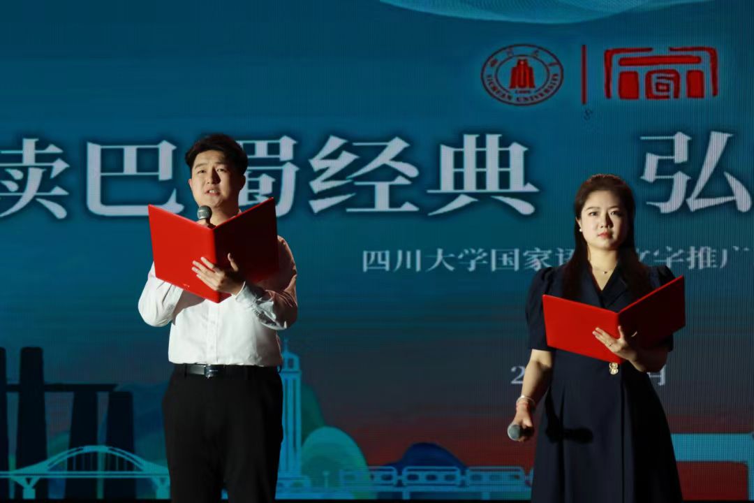 在“诵读巴蜀”展演活动中,由新葡萄8883官网amg文学与与新闻学院朱姝副教授指导,新葡萄官网研究生辅导员郑格老师与硕士研究生董源同学合作诵读的《谁是最可爱的人》获现场一致好评。
