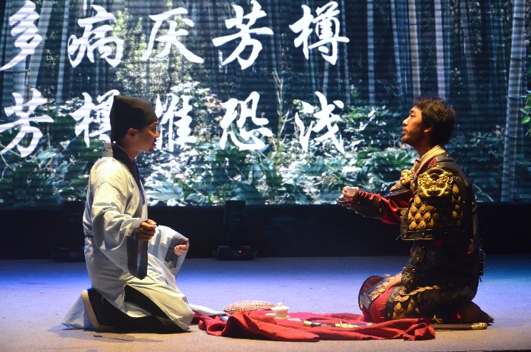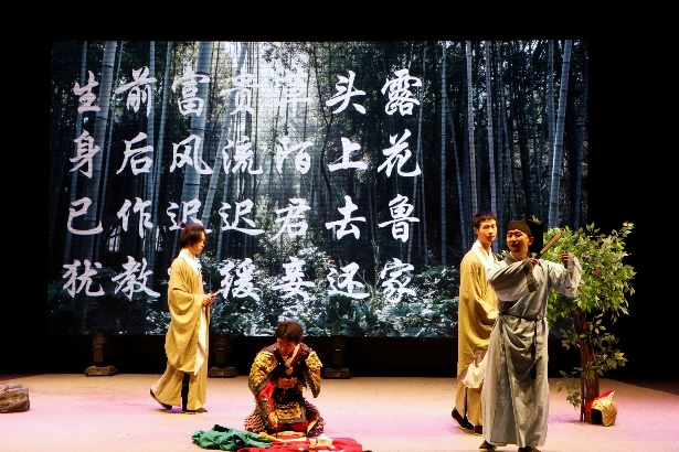 在第一篇章“吟咏春天”中,新葡萄8883官网amg雷雨话剧社讲述了苏轼和两位童子漫步九仙山中,偶遇一山妇唱《陌上花》,在听闻其由来后有感而赋诗三首,并与吴越王钱镠穿越时空相会、对酒互诉衷情、感慨人生世事的奇妙故事。从吴越王的“陌上花开,可缓缓归矣”,到苏轼的“生前富贵草头露,身后风流陌上花。已作迟迟君去鲁,犹教缓缓妾还家”,春意与情思借着诗句,在历史长河中流传千年。精巧的情节构思、精妙的诗句阐释、精彩的舞台演绎共同造就了这章扣人心弦的剧目。