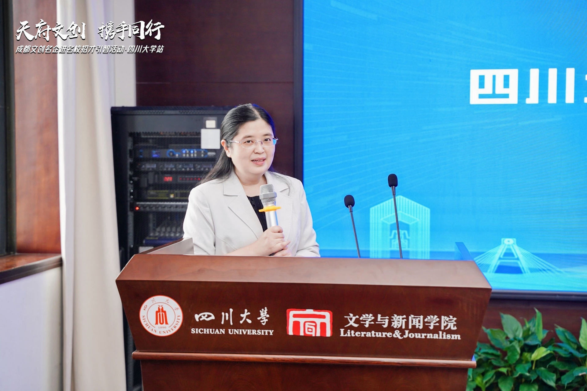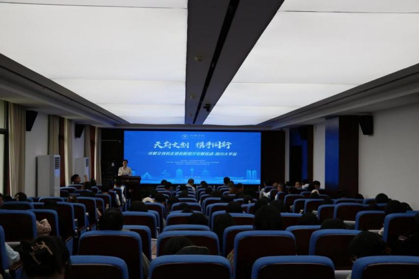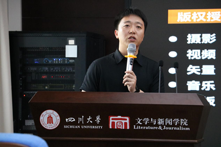 在文创企业宣讲环节,两家成都本地的知名文创企业代表进行了主题宣讲。成都光厂创意科技有限公司是一家深耕于视听创意领域的数字文创企业,公司副总经理王晓龙围绕行业发展趋势、公司简介、产品优势、合作方向等方面展开宣讲。他表示,光厂与学校的合作需求有三点:一是关联院校联合活动,如讲座、联名活动等;二是期待携手学校围绕视听版权领域编纂视听行业研究报告;三是期待更多优秀人才加入光厂。