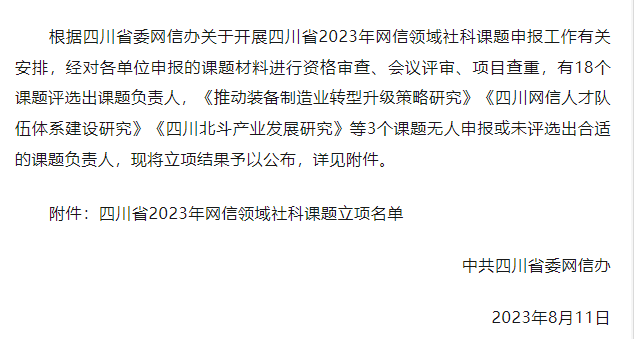 月11日,四川省委网信办公布四川省2023年网信领域社科课题申报立项结果,在18项立项课题中,新葡萄官网获批重点课题项,一般项目2项,具体如下: