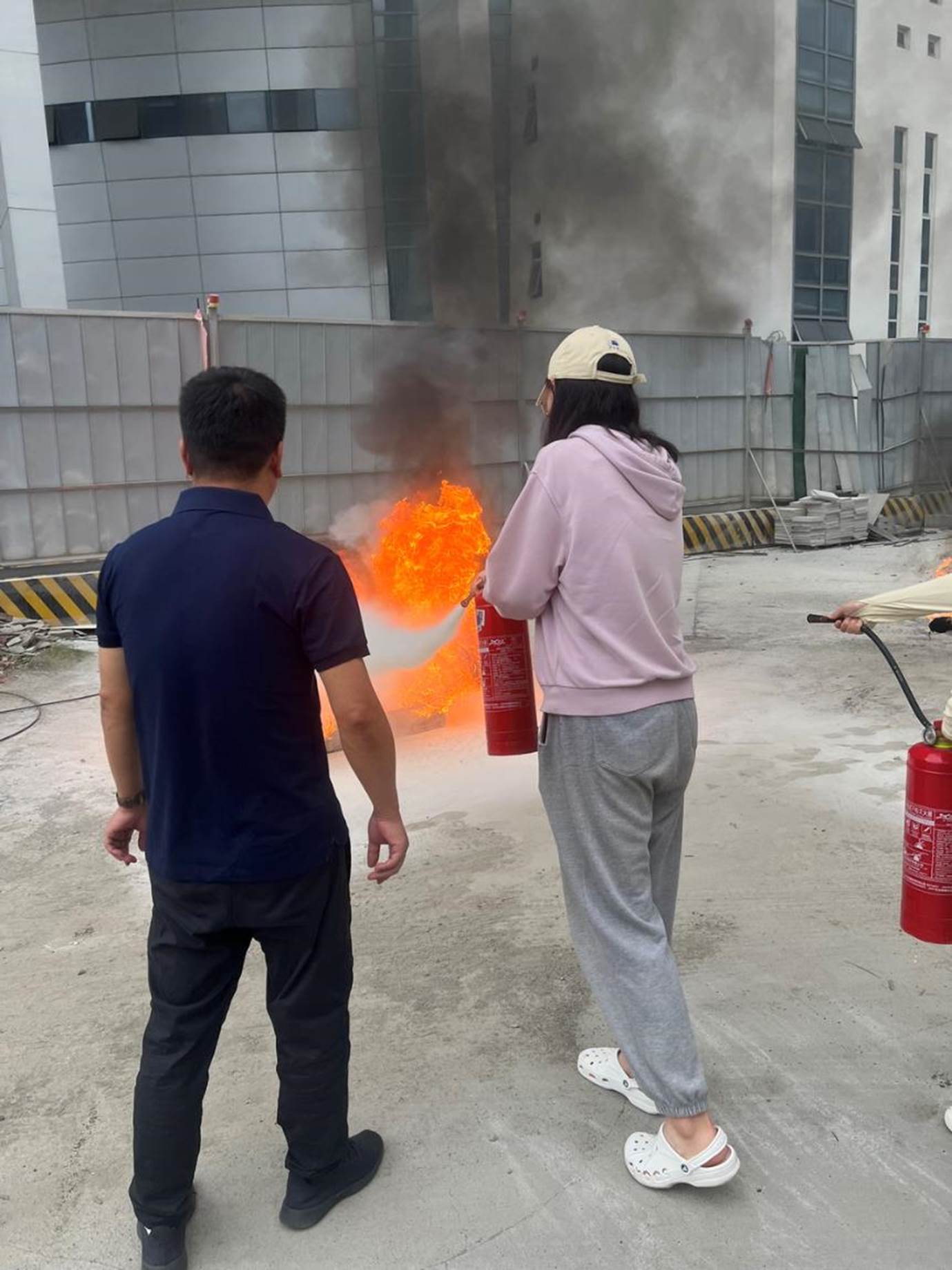 师生在保卫处老师指导下使用灭火器扑灭实际火源